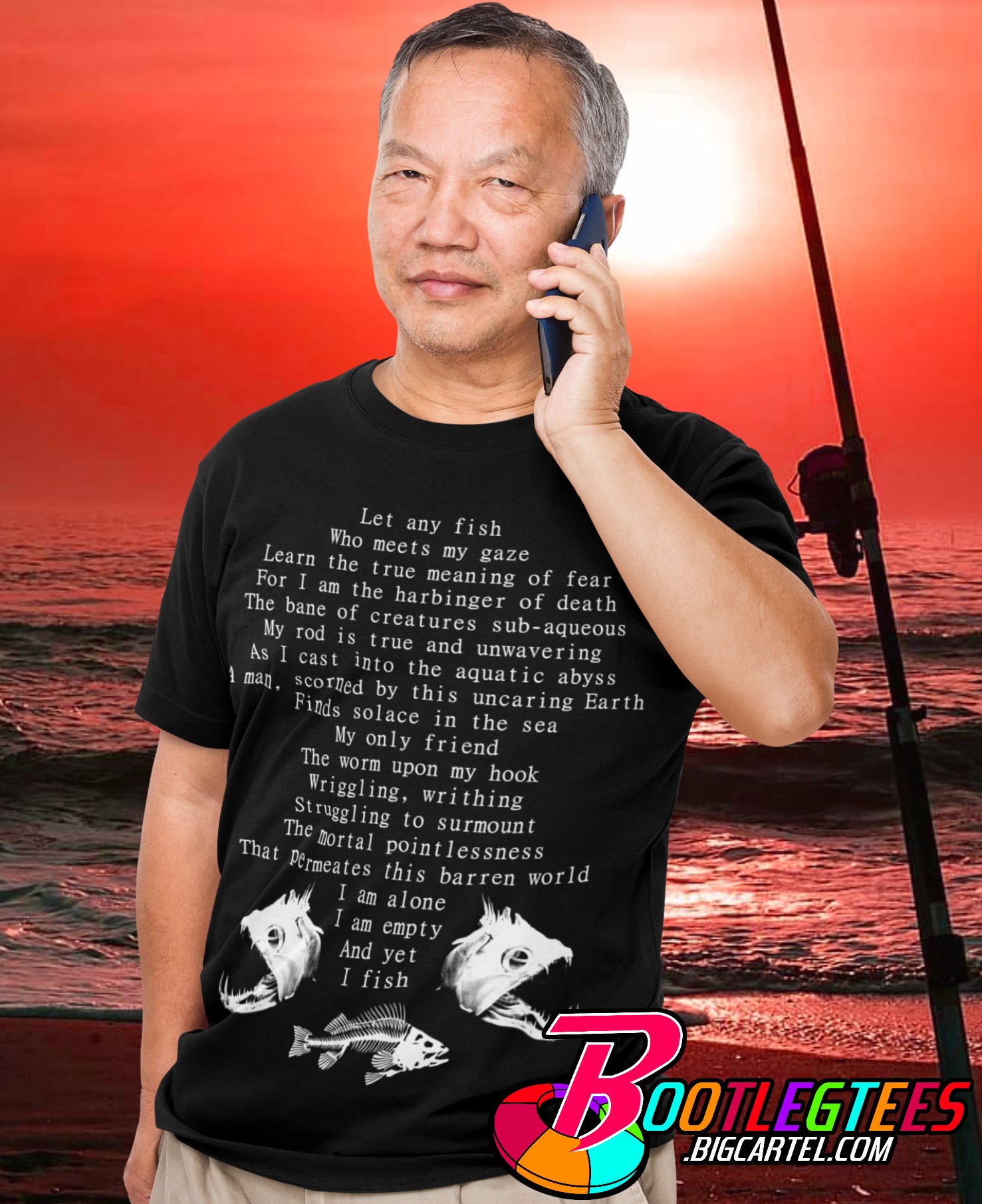 Let any fish who meets my gaze learn the true meaning of fear; for I am the harbinger of death. The bane of creatures sub-aqueous, my rod is true and unwavering as I cast into the aquatic abyss. A man, scorned by this uncaring Earth, finds solace in the sea. My only friend, the worm upon my hook. Wriggling, writhing, struggling to surmount the mortal pointlessness that permeates this barren world. I am alone. I am empty. And yet, I fish.